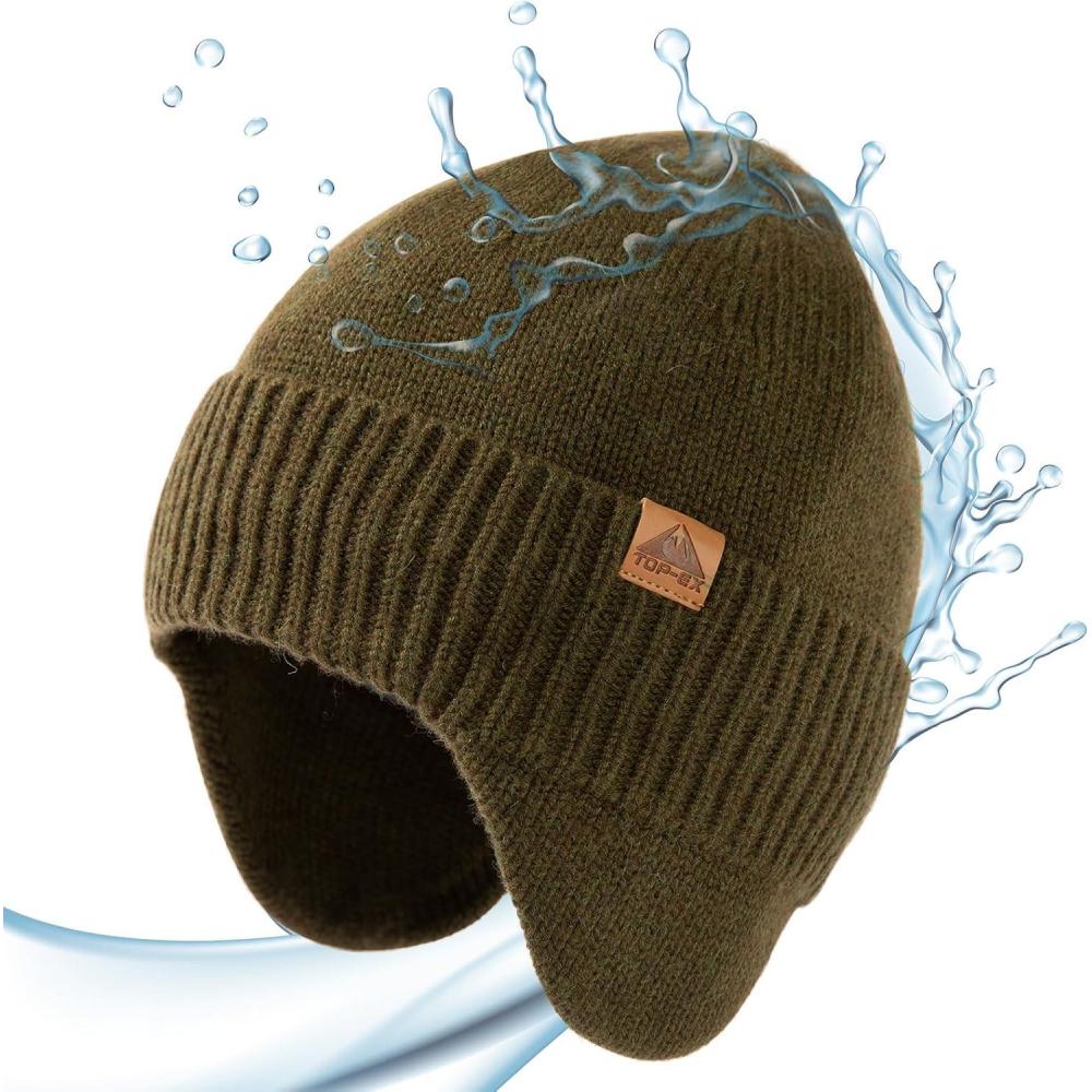 TOP-EX DryKnit™ Unisex 80% Merino Wool Waterproof Beanie with Ear Flap Warm Winter Fleece Lined Beanie Hat M/L/XL(Green)