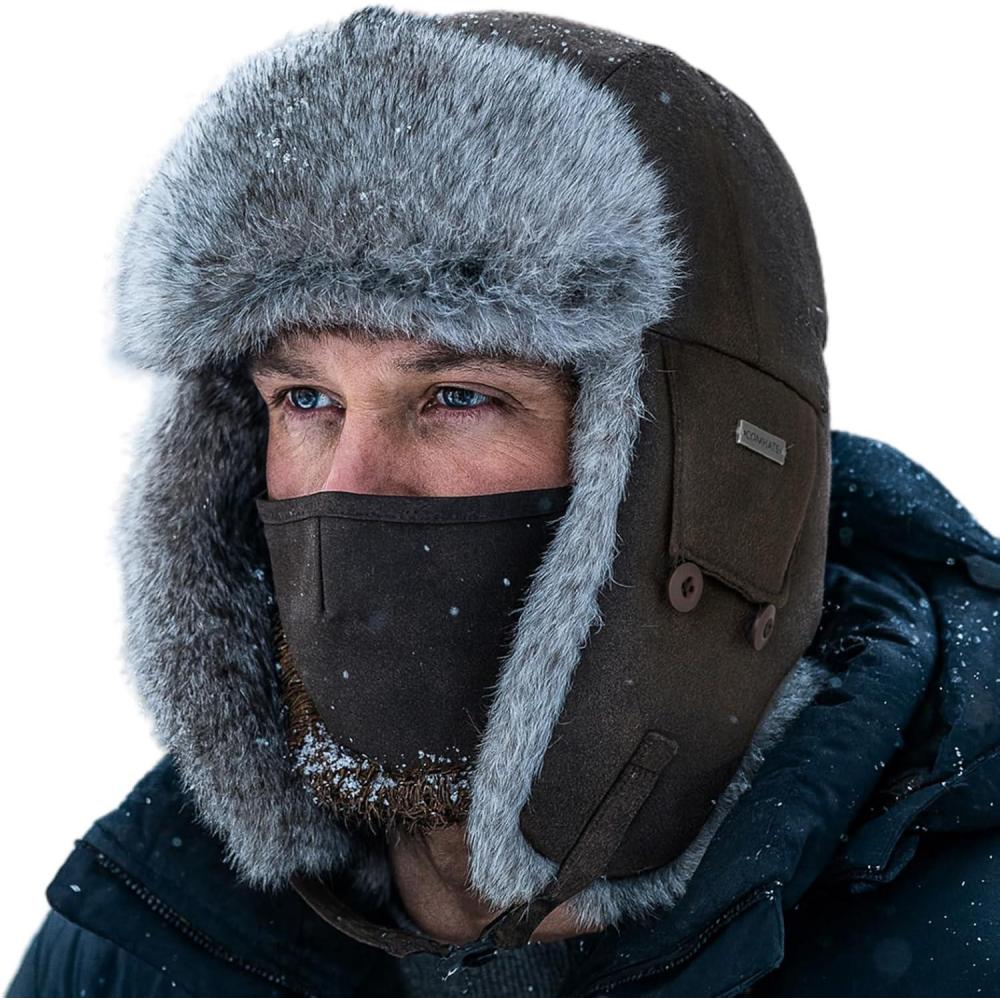 Comhats Aviator Hat Faux Leather Pilot Cap Oversize Adult Men Winter Trapper Hunting Hat 56-66CM(Brown)